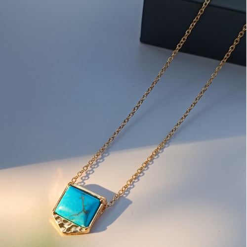A Aqua Veil pendant in a gold frame. Bright statement piece with a refined look.
