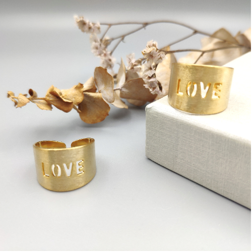 Alloy ring in a bold gold finish with LOVE lettering. Playful statement piece for everyday styling.