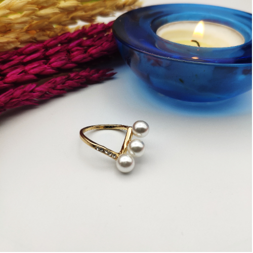 Pearl ring with three pearl accents on a warm gold tone band. Elegant statement piece with a refined modern look.