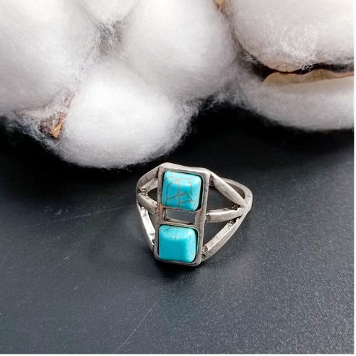 Natural stone ring with stacked turquoise rectangular stones on a silver band. Bold statement style with a geometric finish.