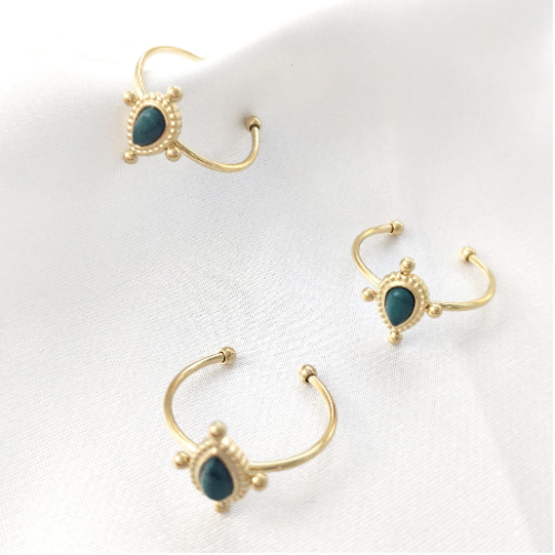 Natural stone ring with a teal marquise stone on a slim gold tone open band. Delicate modern style with a refined finish.