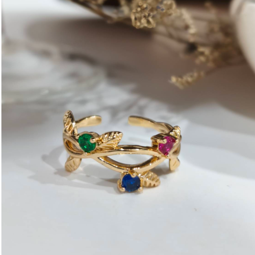 Natural stone ring with multicolor crystal accents arranged on a slim gold tone band. Delicate statement style with a playful polished finish.