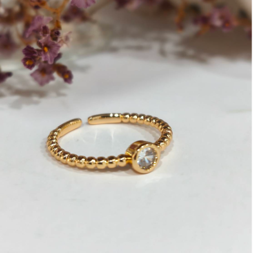 Natural stone ring with a curved row of clear crystals on a slim gold tone band. Delicate statement style with a clean sparkling finish.