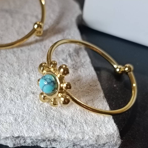 Natural stone ring with a turquoise center stone and small petal accents on a slim gold band. Delicate piece with a floral finish.