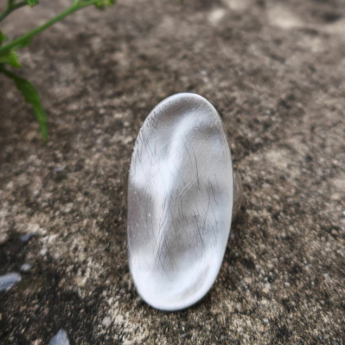 Alloy ring in a brushed silver finish with an elongated oval top. Minimal modern design with a clean statement profile.