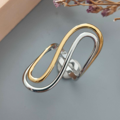 Adjustable ring with silver and gold tones in a smooth infinity inspired shape. Sleek modern design with a minimal statement look.