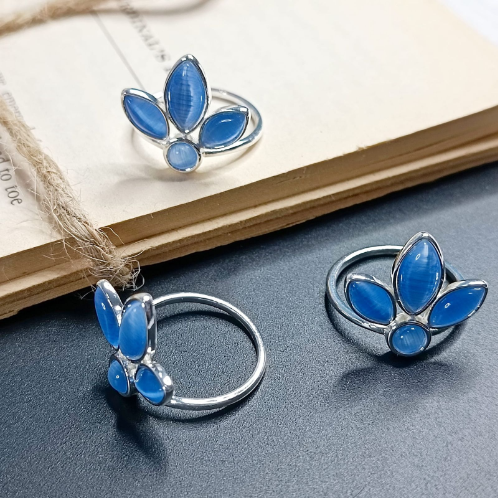 Natural stone ring with blue petal stones on a silver band. Delicate floral statement style with a polished finish.
